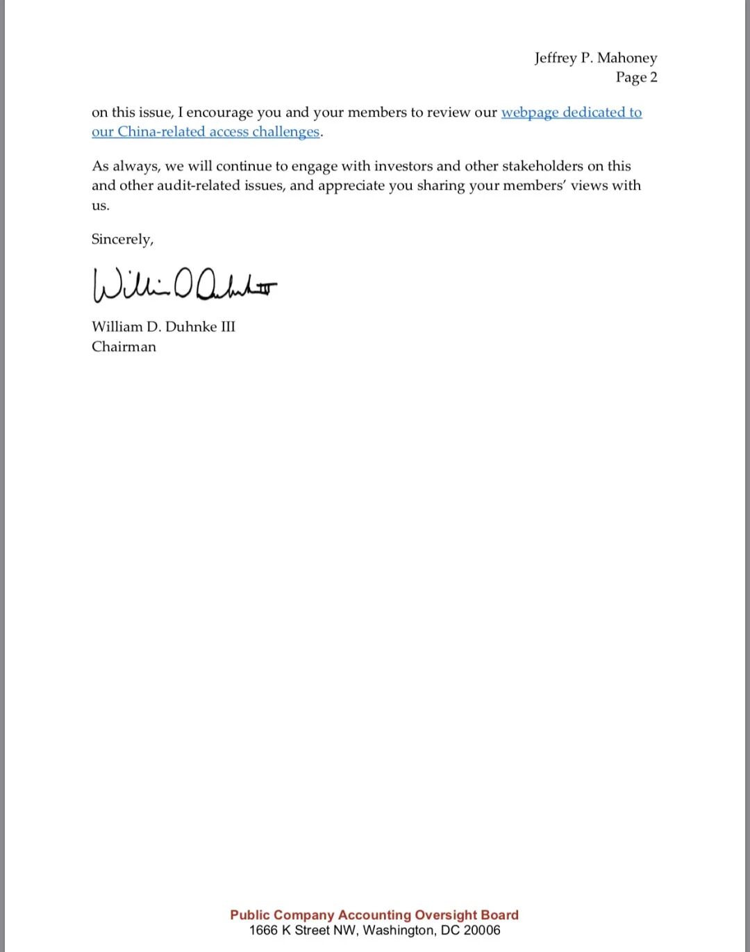 PCAOB 主席的回信全文如下:
