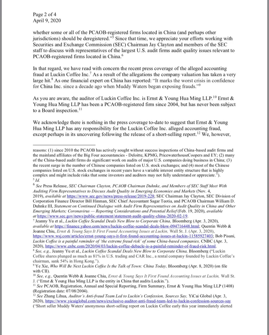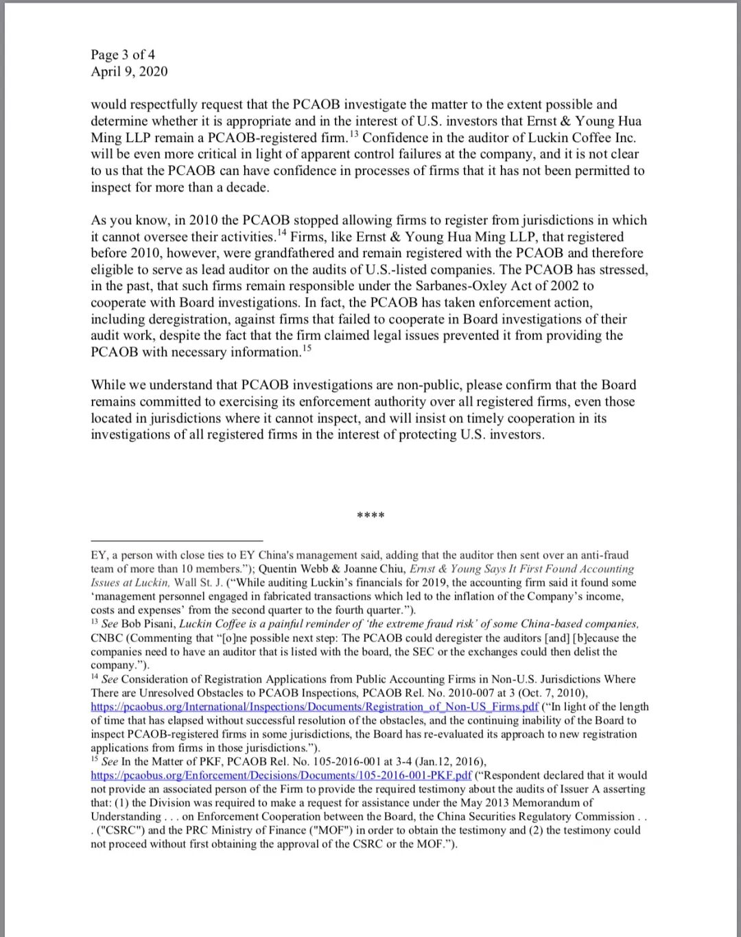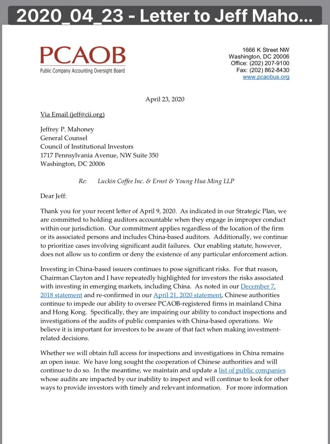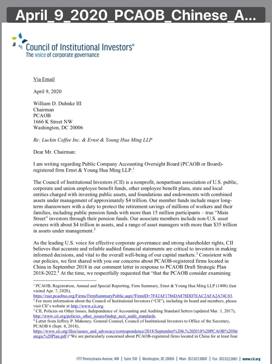 2020 年4月9日, 美国投资者协会 Council of Institional Investors (CII) 总法律顾问致信给 美国公众会计师监督委员会(PCAOB)主席, 督促该机构考虑吊销在该机构注册的中国会计所的审计资格, 并考虑是否应当启动对瑞幸审计师安永中国成员所(安永华明)的调查,以确定是否应当吊销其审计资格。