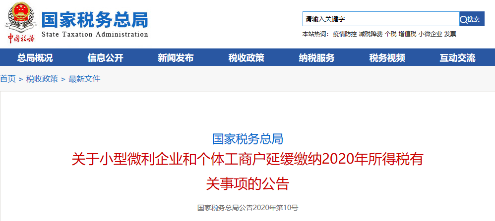 为进一步支持小型微利企业和个体工商户复工复产,缓解其生产经营资金压力,激发市场主体活力,现就小型微利企业和个体工商户延缓缴纳2020年所得税有关事项公告如下: