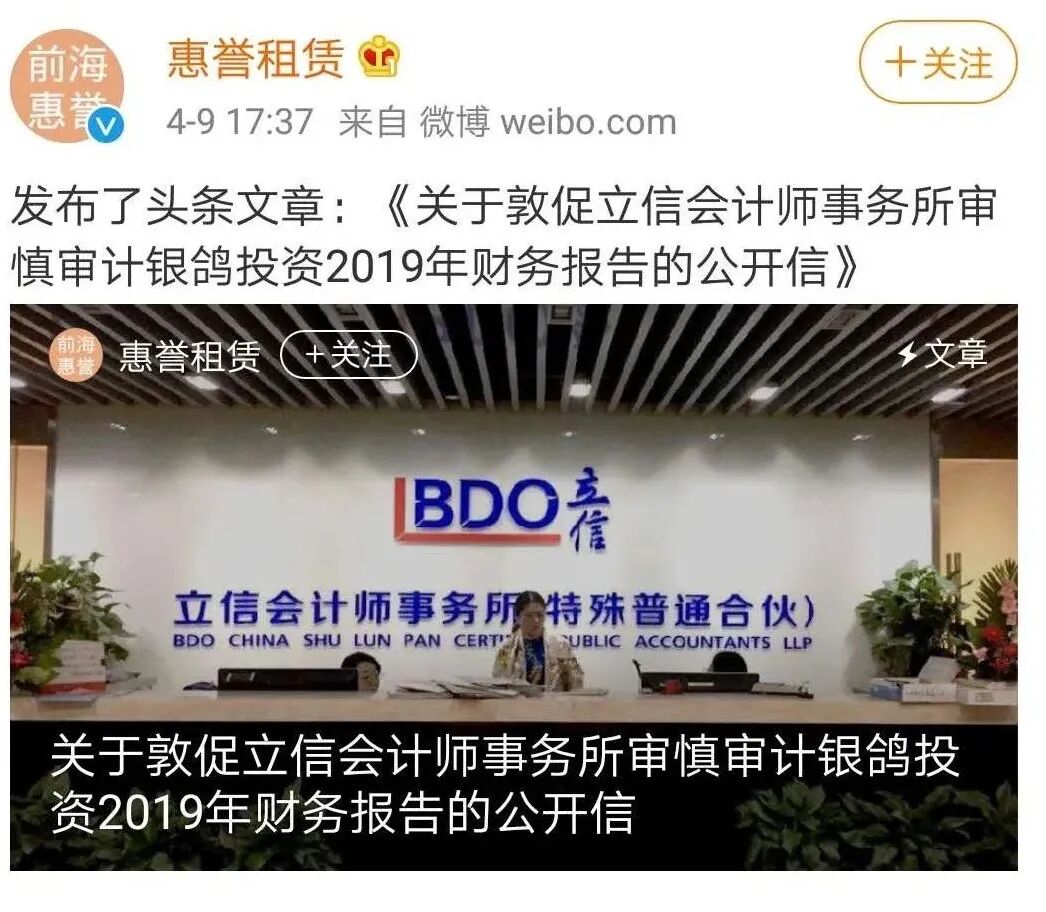 同时,本人及惠誉租赁公司将继续向监管机构和社会公众公开银鸽投资及孟飞团伙更重磅的违法犯罪事实及证据材料,若贵所不及时“全身而退”,届时难免受到严重波及。希望贵所切实履行职责,出具对贵所、银鸽投资、监管机构和广大中小投资者负责任的审计意见。