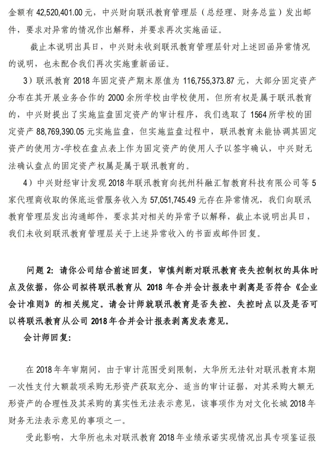根据大华所2018年的审计报告及问询函的专项说明,联汛教育管理层的违约、 违背章程的行为和事实发生在2018年及2018年年度审计期间,导致审计机构无法对其2018年财务报表发表审计意见,导致上市公司无法对其2018年度的业绩承诺实现情况作出审核,无法确定联汛教育原股东是否需要承担补偿责任,公司自2018年起不再合并联汛教育财务报表,将联汛教育的长期投资转入其他权益工具投资核算,公司已经开始相关财务报表信息的更正工作。