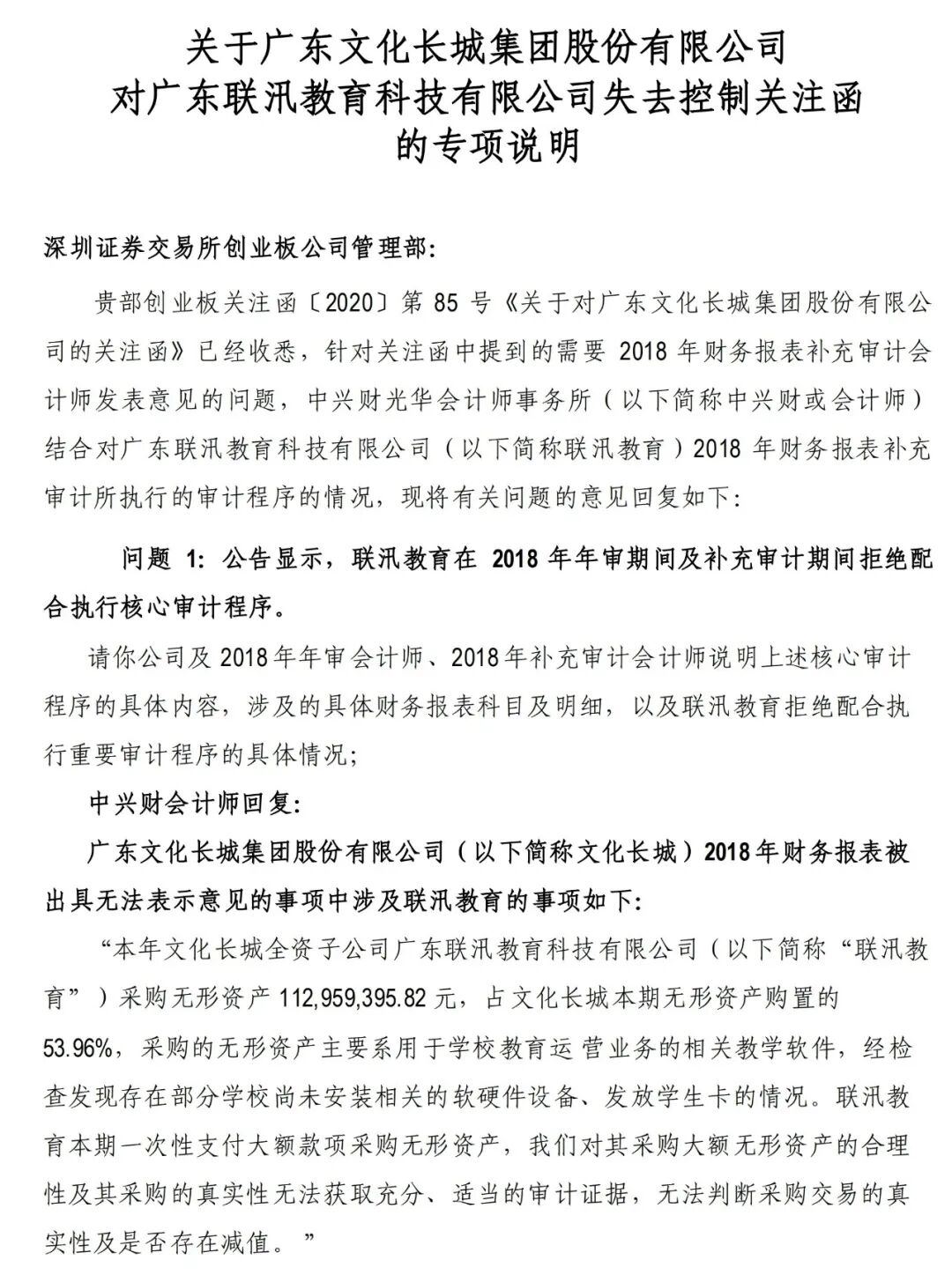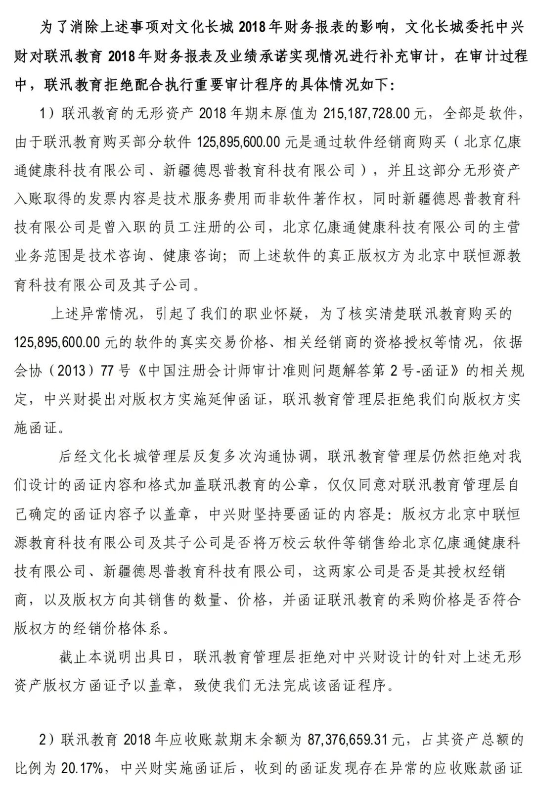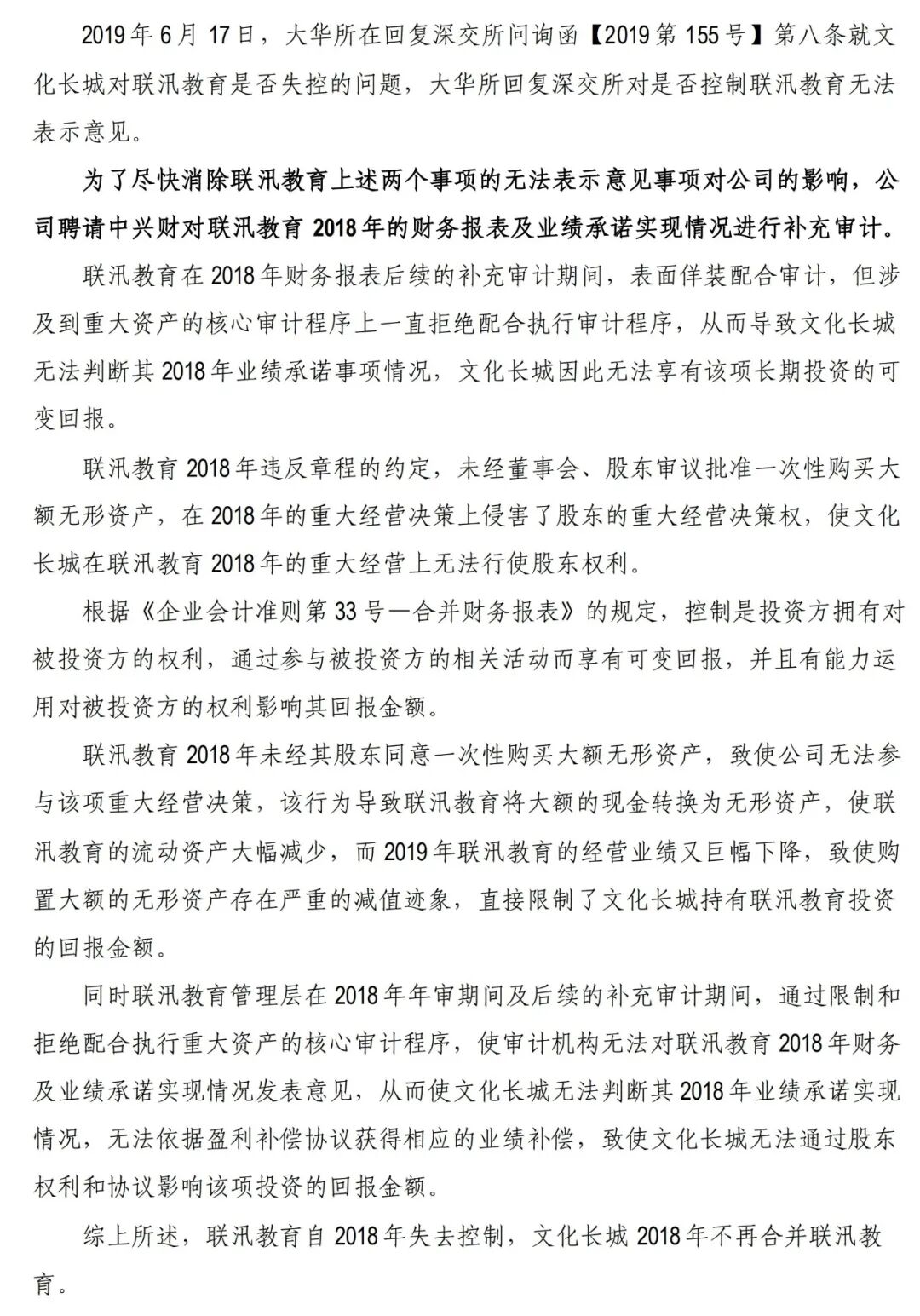 2018年被出具无法表示意见的审计报告后,为消除无法表示意见的影响,文化长城立即对无法表示意见的事项进行梳理改进,并聘请中兴财光华会计师事务所重新审计及补充审计,但联汛教育管理层仍然拒绝执行董事会决议和公司股东决议,拒不交接公章账册。