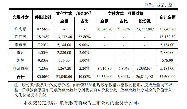 文化长城2016年以5.76亿元的价格获得联汛教育80%的股权,其中现金支付对价2.304亿元,股份支付对价3.46亿元。
