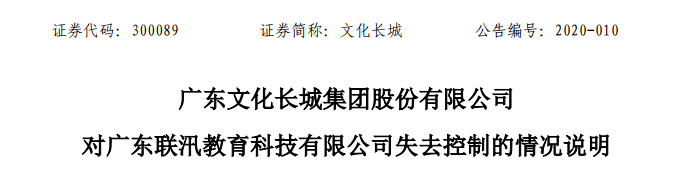 今年1月23日,文化长城公告宣布对联汛教育失去控制。