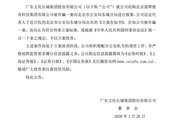 文化长城2月26日对外公告,公司已就收购翡翠教育被诈骗一案向北京市公安局东城分局报案,东城分局认为符合刑事立案标准并予以立案侦查。