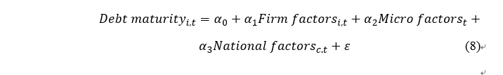 其中,Debt maturity、Firm factors、 Micro factors 和National factors分别表示公司的债务期限结构和影响公司债务期限的公司层面因素、宏观经济因素以及国家层面的因素。国家层面因素一般采用跨国数据进行分析。通过估计参数α1、α2、α3并检验其统计上的显著性从而判断哪些因素会影响以及如何影响公司的债务期限结构。
