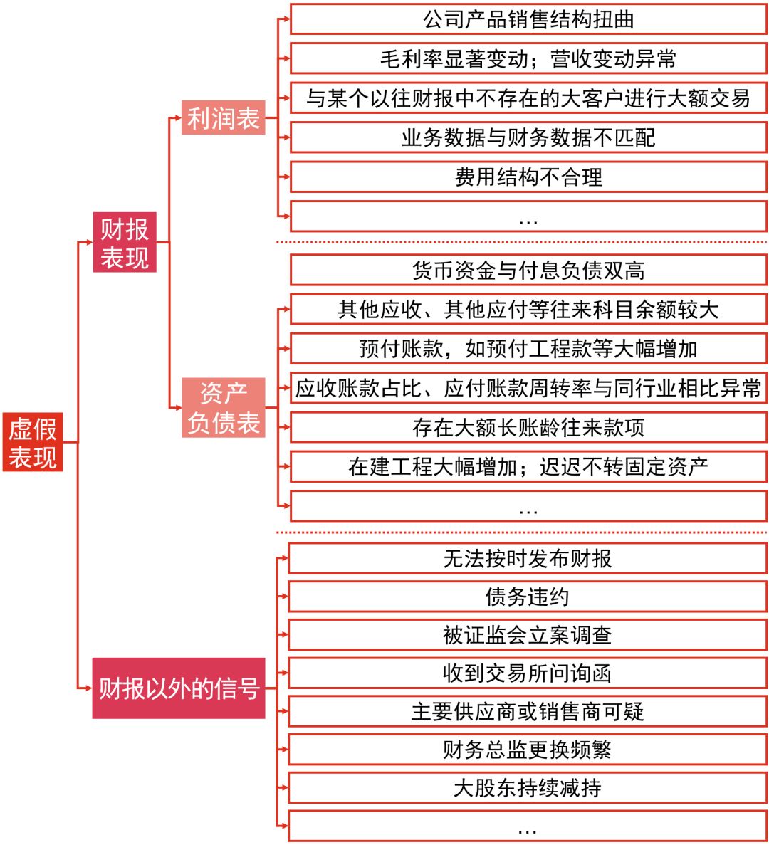 财报舞弊多从直观的利润表出发,呈现出三个阶段:1)通过多种方式操纵利润;2)通过高估资产、低估负债来改善整体财务状况;3)通过伪造现金流和关联交易的方式调节报表科目、掩盖舞弊迹象。