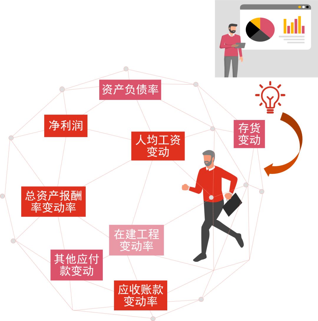 百万特征排水归纳:通过对数据进行标准化和集中化处理,可交叉进行比对,同时建立多维度、多视角的特征标签。在对相关信息及指标进行降维、归纳后,可汇总成丰富、全面的财报风险提示全景画像,使得数据结果“可视化”,更直观地呈现公司风险,由点及面揭示财报舞弊的线索。